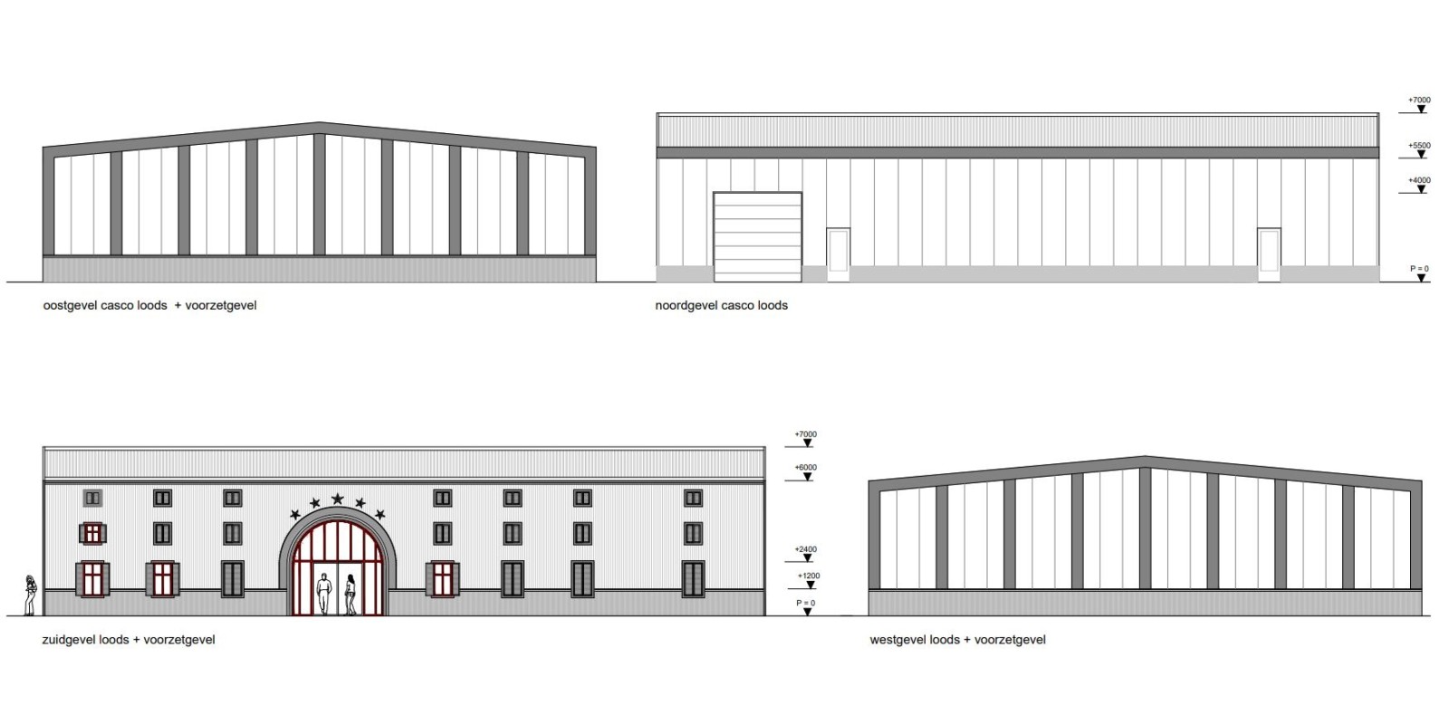 Ontwerp voor een standaard nieuwbouw bedrijfsloods welke wordt voorzien van een voorzetgevel aan de voor- en zijgevel. Door deze toevoeging ontstaat de uitstraling die past bij het cateringbedrijf. De voorzetgevel wordt gerealiseerd in hout met toevoegingen in hardsteen rondom de kozijnen en houten luifels.